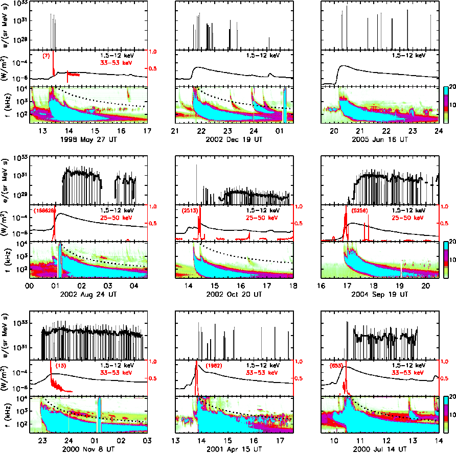 We review the transport model and the fitting technique in Sect. 2. In Sect. 3, we show the observational characteristics of the total of eleven NR electron events selected for the study. Section 4 reviews the electromagnetic emissions observed in association with the electron events. Section 5 gives an overview of the results of deconvolving the sectored intensities observed during the selected events. Results are summarized in Sect. 6.