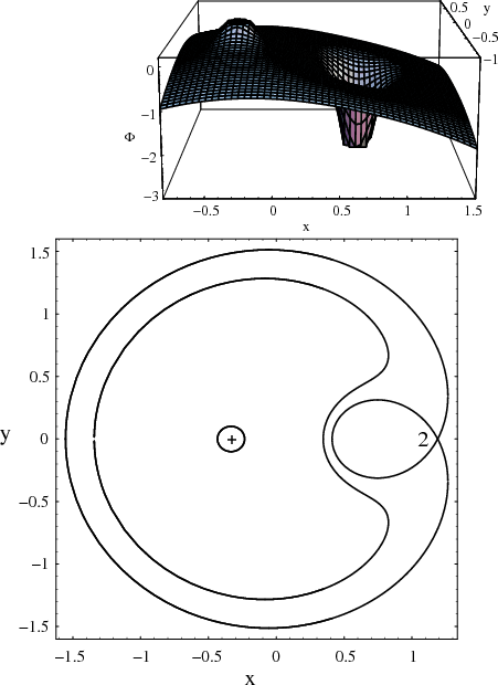 are respectively the distance of a test particle located at (x,y,z) to the primary star (labelled ``1'' and located at