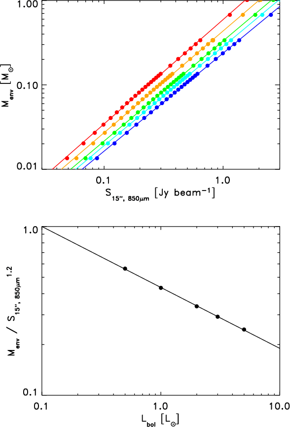 the relation between envelope mass and peak flux in the JCMT beam for