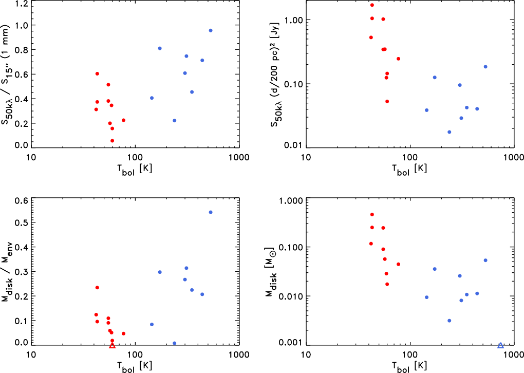 disk mass ( right). Class 0 sources are