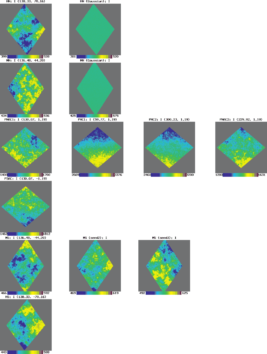 Figure B.1: Total intensity I maps for all the simulated patches in gnomonic projection. The centre coordinates are given on top of each panel together with its label (see Table 1 for details). Intensities are in mK brightness temperature at 1.4 GHz. The minimum and maximum of each map is shown together with the wedge below each panel. |