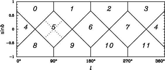 Figure 1: The HEALPix pixel scheme (Górski et al. 2005) for Galactic coordinates used in this paper. |