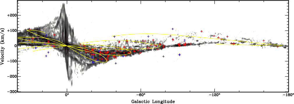 Figure 7: Galactic longitude-velocity plot showing the velocities of all H2O masers detected as a function of Galactic longitude. Masers associated with an RMS source are shown in red, while unassociated H2O masers are shown in blue. The distribution of molecular material is shown in grey scale (Dame et al. 2001) for comparison. The location of the spiral arms taken from the model by Taylor & Cordes (1993) and updated by Cordes (2004) are over-plotted in yellow. |