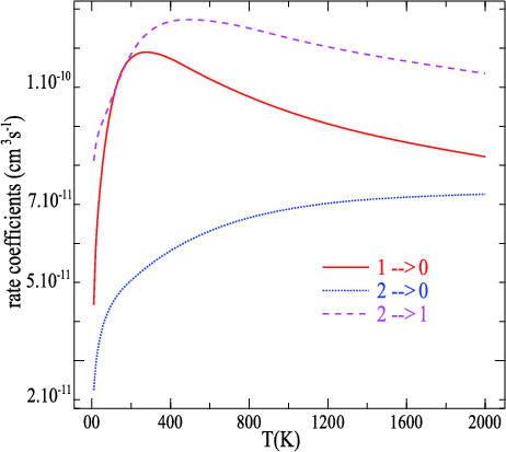 Table 2: Downward rate coefficients of rotational levels of CH+ in collision with He as a function of kinetic temperature (in units of cm3 s-1).