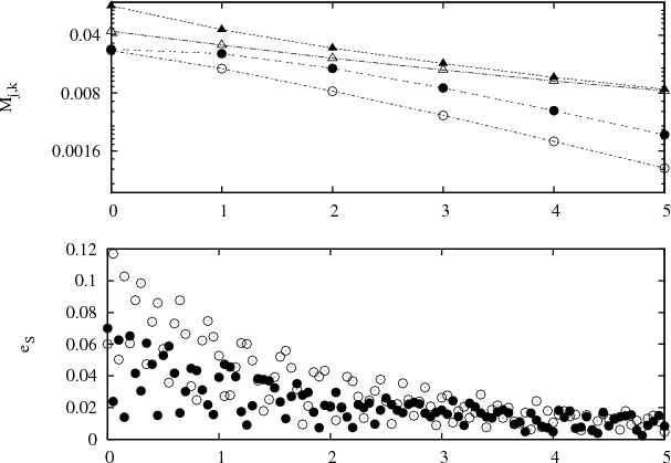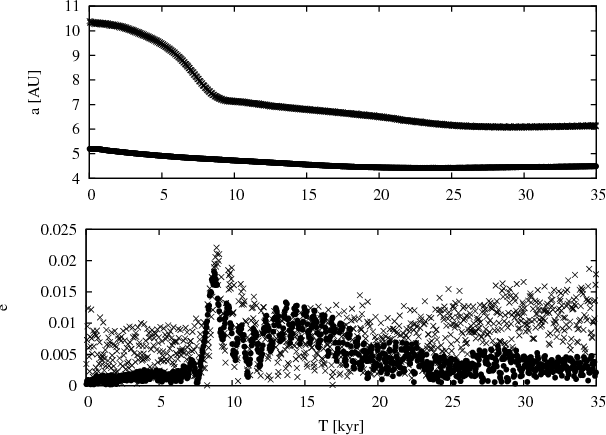 In addition, the interactions between Jupiter and Saturn, as they evolve and migrate in the disk of gas, should not lead to a significant enhancement of their eccentricities. Figure 1 shows a typical evolution of the Jupiter-Saturn pair, from Masset & Snellgrove (2001). The top panel shows the evolution of the semi-major axes, where Saturn's semi-major axis is depicted by the upper curve and that of Jupiter is the lower trajectory. Initially far away, Saturn swiftly approaches Jupiter, possibly passing across their mutual 2:1 resonance (at approximately 9000 yr in the figure), and is eventually trapped in the 3:2 resonance. At this point, the migration of both planets slows down slightly and then reverses. Morbidelli & Crida (2007) argued that this dynamical evolution explains why Jupiter did not migrate all the way to the Sun in our System. Pierens & Nelson (2008) convincingly demonstrated that the trapping in the 3:2 resonance is the only possible outcome for the Jupiter-Saturn pair. The lower panel of Fig. 1 shows the evolution of the eccentricities of both planets, where Saturn's eccentricity is depicted by crosses and that of Jupiter by bullets. Both eccentricities remain low all the time. The burst of the eccentricities associated with the passage through the 2:1 resonance at approximately 9000 yr is rapidly damped. Once trapped in the 3:2 resonance, the equilibrium eccentricities are approximately 0.003 for Jupiter and 0.01 for Saturn, i.e. five to ten times smaller than their current values.