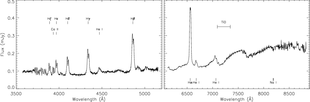 Figure 1: Flux-calibrated average spectrum of SDSS J1006. Data from the blue arm of ISIS are shown in the left panel, and from the red arm in the right panel. The most prominent emission and absorption features are labelled. |