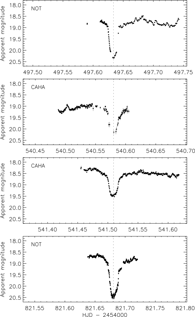 The light curves are plotted in Fig. 3 with the measured eclipse midpoints indicated. It is apparent from this plot that the depth of the eclipse is dependent on the wavelength of observation: the Calar Alto data were unfiltered, so are more affected by the light of the secondary star and thus show shallower eclipses.