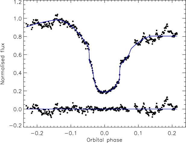 code, which we find gives reliable error estimates for the optimised parameters (Southworth et al. 2005). The orbital period was fixed at the ephemeris value (Sect. 3.1),