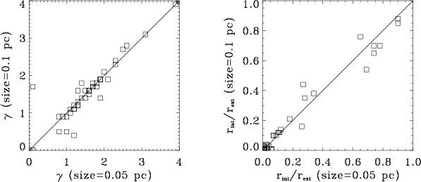 Figure 2: Comparison between the derived model parameters for the two analyzed source diameters (0.1 pc and 0.05 pc). Left panel: index of the power law that describes the density gradient inside the source. Right panel: ratio of internal to external source radii. |