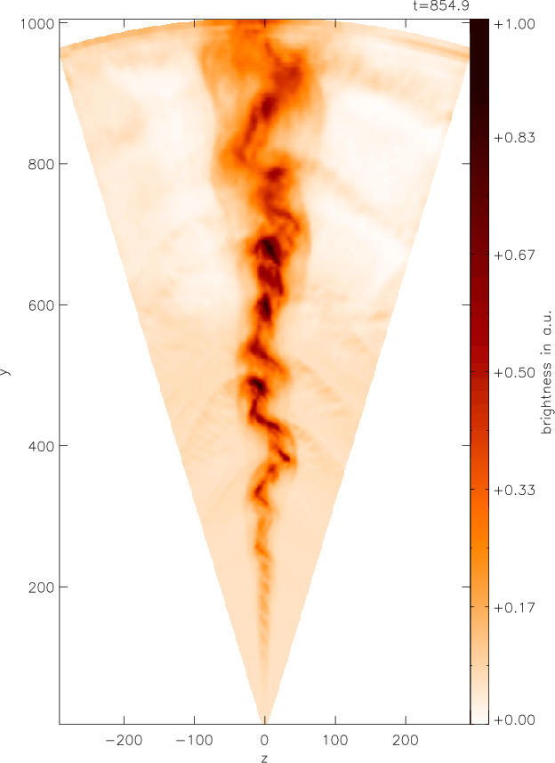 Dissipation of magnetic energy in the flow causes heating. In nature this would lead to losses by radiation; in the computations it can cause numerical problems in regions where the magnetic energy dominates. Instead of a more realistic model for such losses, a temperature-control term is added in the energy equation, such that the temperature relaxes to that of the initial state on an appropriate time scale. In the simulations presented here this time scale is chosen such that the temperature stays within about a factor 100 around the initial value.