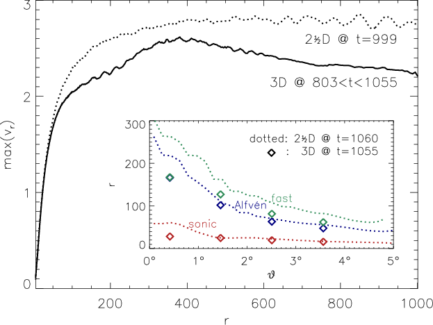 about 2-15 times the Alfvén distance. We compare the results with a 2.5D