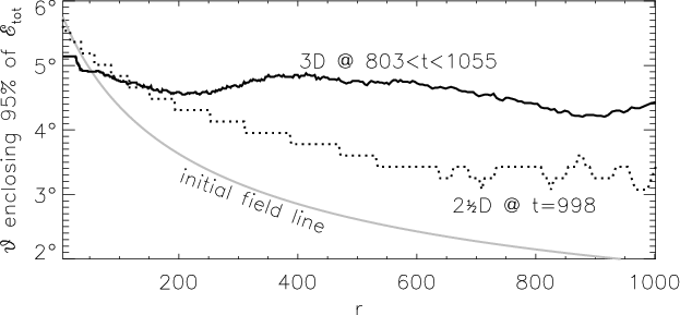 Figure 4: Jet boundary, defined by the angle that encloses 95% of the total energy flow (see Eq. (8)), as a function of distance. The unstable 3D jet is less collimated than the 2.5D jet. |