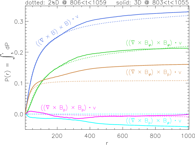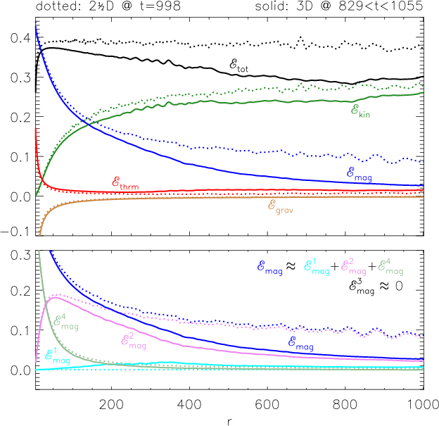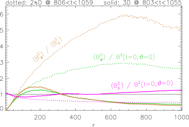 Figure 8: Magnetic field components, integrated over the jet cross section, as a function of distance, on a logarithmic scale. In a sphericallyexpanding ballistic flow these quantities would be constant, see text. |
