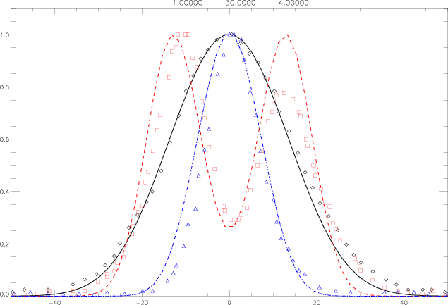 Figure B.1: Emission-line profiles: models (lines) and observations (Gesicki et al. 1996, symbols), for / (black solid line and diamonds), [O/ III] 5007 Å(blue dot-dashed line and triangles), and [N/ II] 6584 Å(red dashed line and squares). Intensities are scaled so that the maximum of each profile reaches 1.0. |