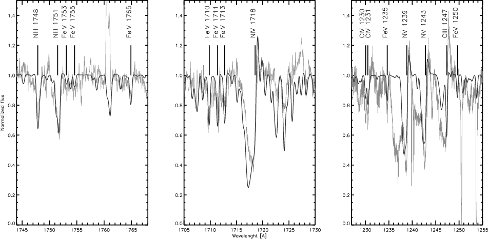 Figure D.1: The fits to the nitrogen and FeIV lines. Note the nebular emission line C/ II 1761 Å. |