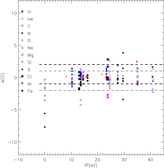 Figure D.8: Nebular abundances by mass from the literature (small crosses, same as in Table 2) and from the adopted model (large stars represent the stellar abundance, and large diamond the nebular abundances). Units are in log(abundance by number) relative to the solar values from Asplund et al. (2005). |