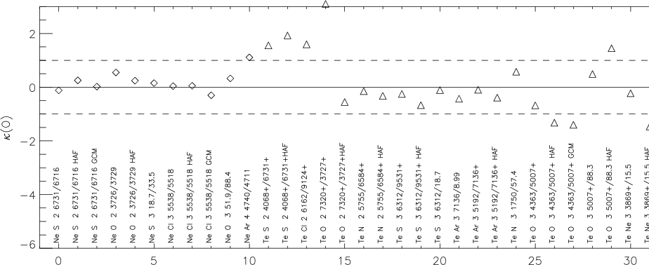 On the other hand, the electron temperature diagnostic [Cl/ II] 6162/9124 Åis found to be predicted coherent with the [S II] and one of the two [O II] diagnostic when using the data of Krueger & Czyzak. For these low ionization lines, the model overpredicts the ratios with