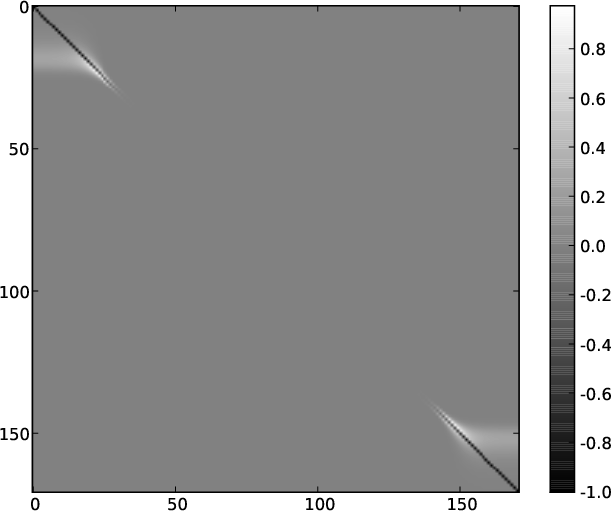 Figure 1: Typical structure of the A operator, computed for the case of a self-emitting 1D, plane parallel finite slab. Such an operator is, more generally, non-symmetric positive definite. For the sake of getting a better contrast for the off-diagonal parts, we magnified the negative values of the original operator by a factor of 5, and we display in fact the opposite of the modified operator. |