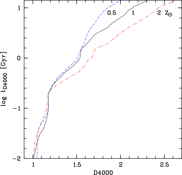 For the calculation of complex stellar populations (CSPs) we consider single stellar populations (SSPs) of Maraston (2005) and PEGASE of different metallicity Z and Salpeter (1955) or Kroupa (2001)