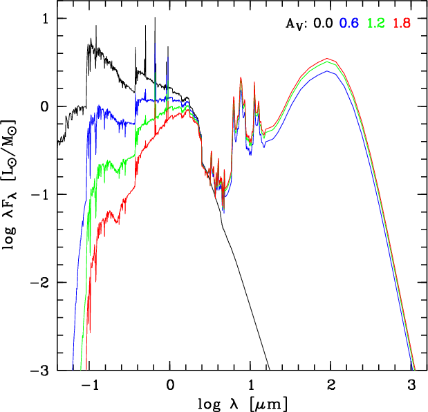 the dust is considered by reddening the stellar SEDs and re-emitting