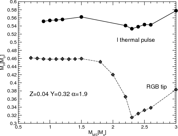 red giant branch (RGB tip) as a function of their initial mass. As is well known, for initial
