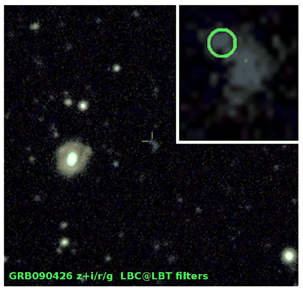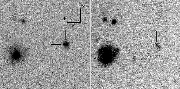Figure 2: R-band images of the field of GRB 090426 observed with the TNG about 0.4 ( left) and 16.5 ( right) days after the burst. In the right panel, a faint, extended object is visible about 1.3'' SW with respect to the optical afterglow position (marked by a cross). |