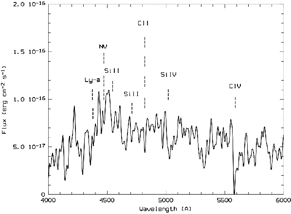 absorption lines (such as NV, CIV and SiIV) in the optical spectrum of the afterglow are strongly indicative of a