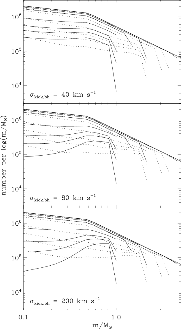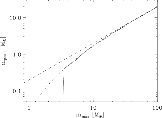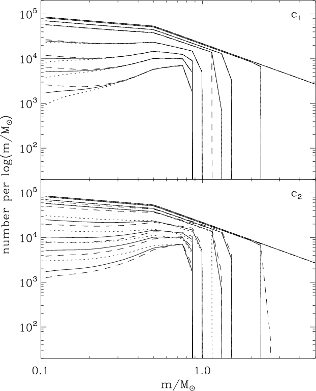 The influence of stellar evolution on the MF is twofold. First of all, the maximum stellar mass decreases, because at any time during cluster evolution the most massive stars reach the end of their lives. Secondly, the stellar remnants that are created upon the death of these massive stars constitute a part of the MF that can only be lost from the cluster by dynamical mechanisms.The maximum stellar mass in the cluster as a function of its age is taken from the Padova 2008 isochrones (Marigo et al. 2008) for metallicities in the range Z=0.0001-0.03. The stellar remnant masses