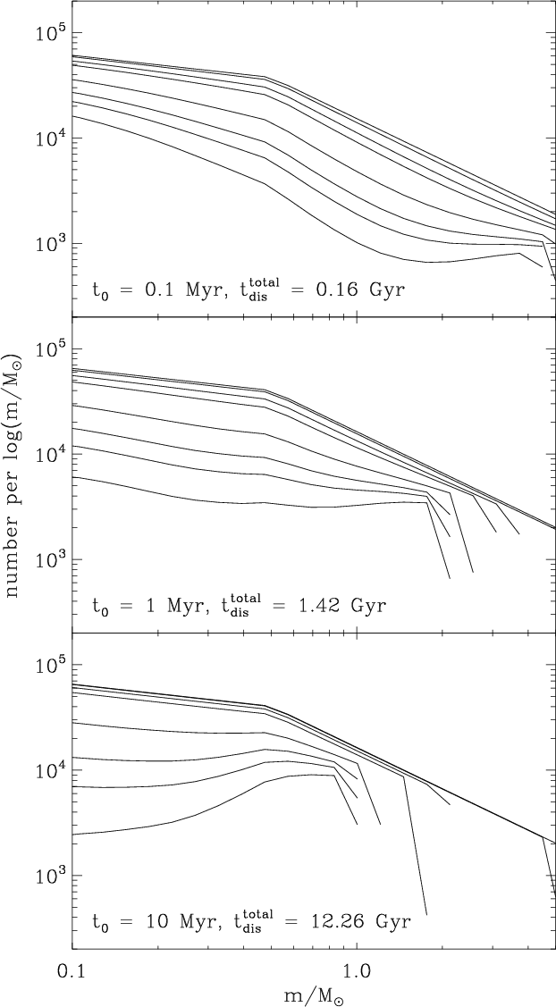 with M the cluster mass, t0 the dissolution timescale parameter which sets the rapidity of dissolution and depends on the cluster environment, and