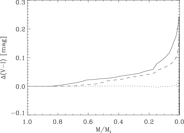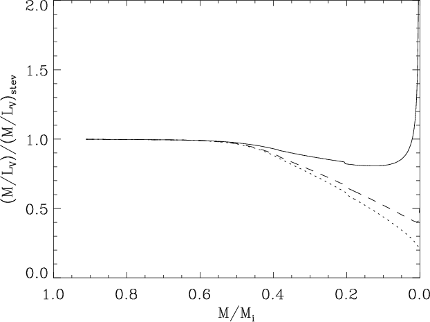 The above formulation of the cluster mass evolution was extended to include stellar remnants, photometric cluster evolution, and a simple description of the MF in the SPACE cluster models (Kruijssen & Lamers 2008). Stellar remnants were accounted for by assuming initial-final mass relations (similar to Sect. 3.1 of the present paper), while the photometric evolution was computed by integrating stellar isochrones from the Padova group (Bertelli et al. 1994; Girardi et al. 2000). The description of low-mass star depletion followed the simple model from Lamers et al. (2006) in which the minimum stellar mass of the MF increases with time.