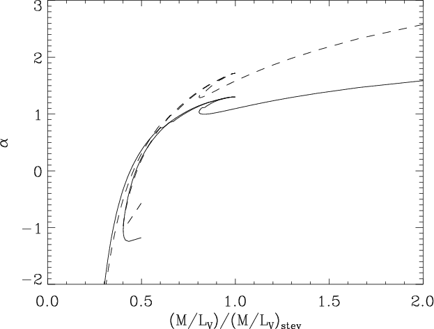- For the clusters with relatively long disruption times that are considered in this section, the variable stellar mass range that was introduced in Sect. 5.1 to trace the relation between MF slope and M/L ratio gives an evolution of the slope that is comparable that for the fixed mass ranges. It is omitted from the figures in this section to improve their clarity.
