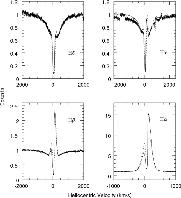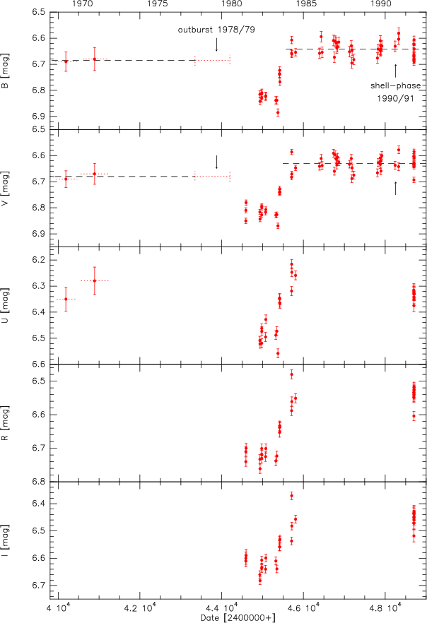 5876), and Na I lines. Spectral variations have also been identified in the UV, by the analysis of IUE spectra (Hutsemékers 1985). These spectral variabilities have been explained by an outburst that possibly happened in 1978-1979 (Hutsemékers 1985) and by a shell phase in 1990-1991 (Andrillat & Houziaux 1991).
