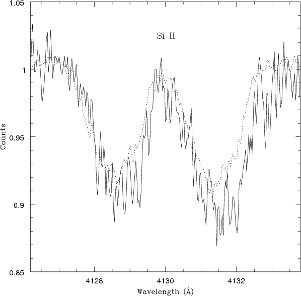 The spectrum of 1999 was obtained with an exposure time of 180 s and has S/N of approximately 80 in the 5500 Å region. In 2007, we were able to take two consecutive spectra of the star, both with 180 s of exposure time. Since these spectra do not show significant differences, we added them up for a better S/N, which is around 250.