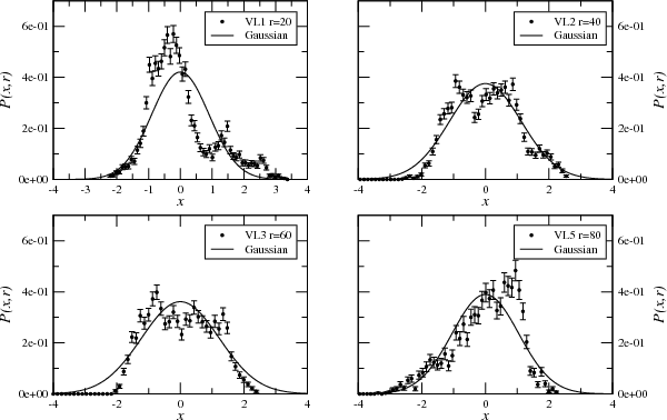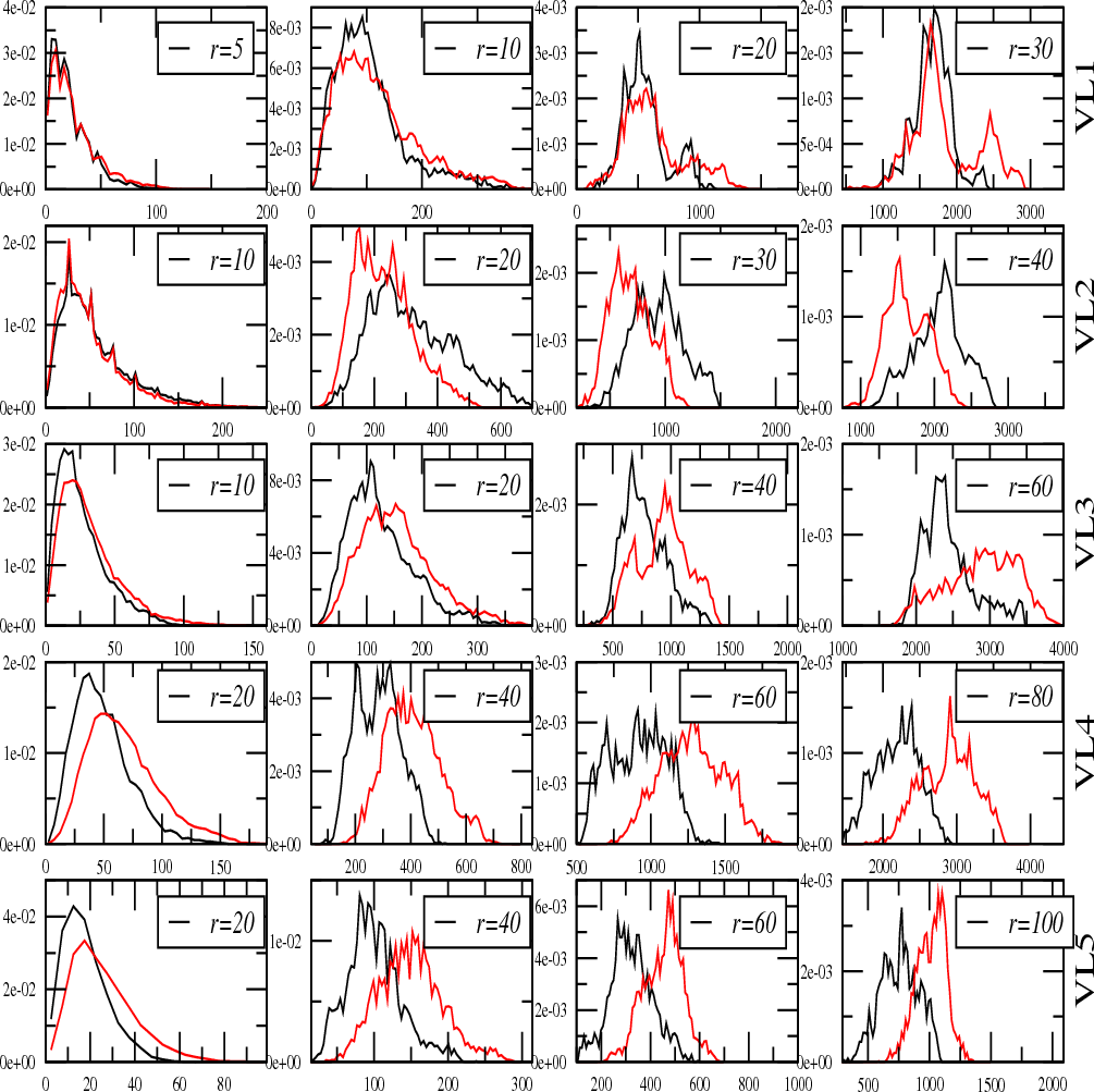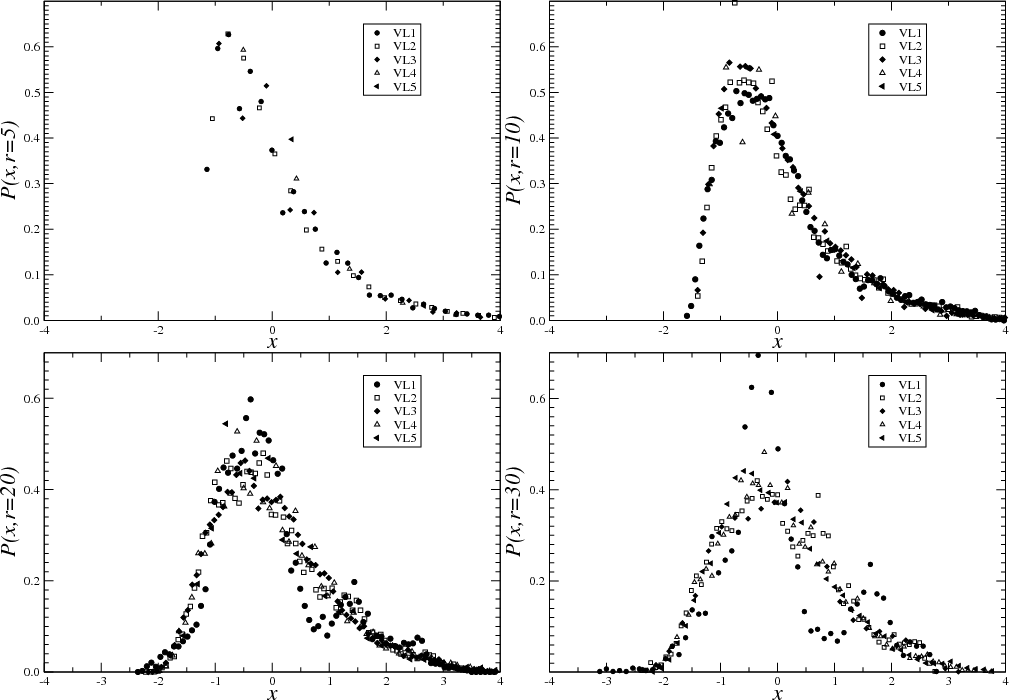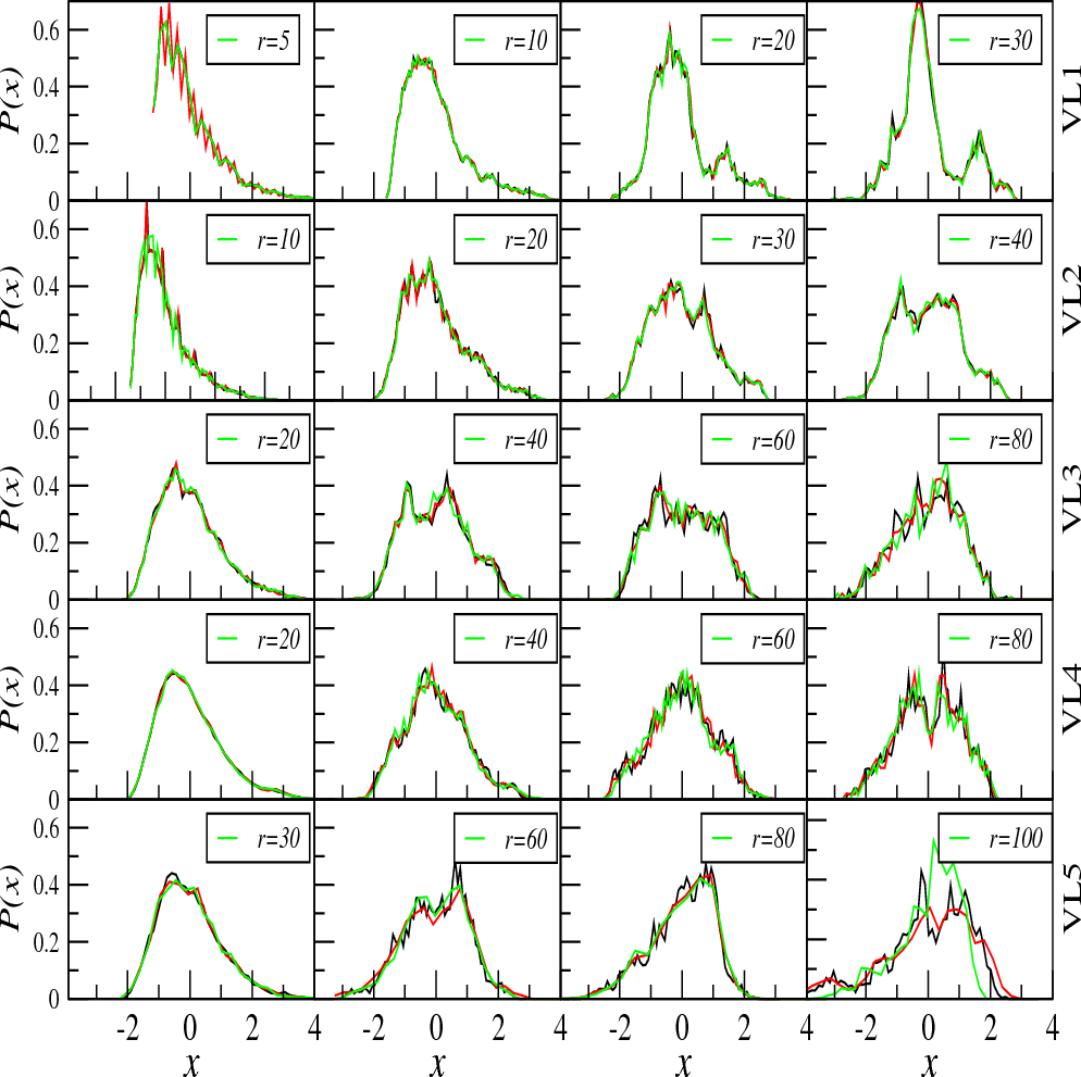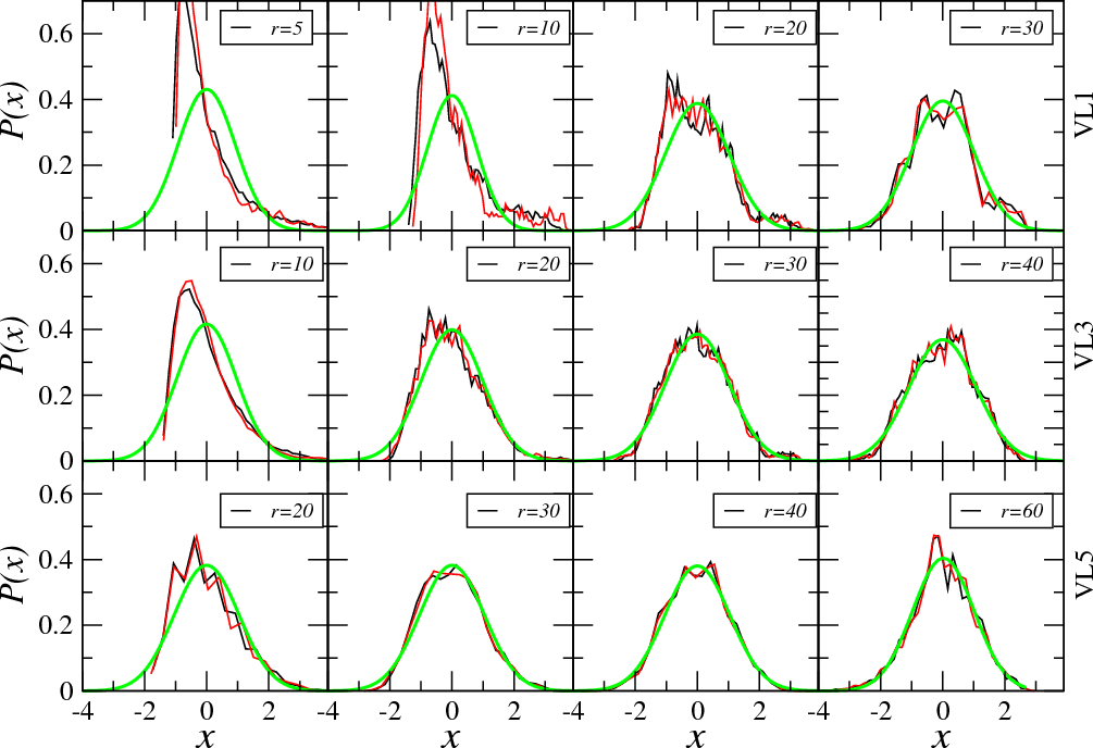 - The PDF of VL1 for r=30 Mpc/h is not as regular as the other cases because of poor statistics.