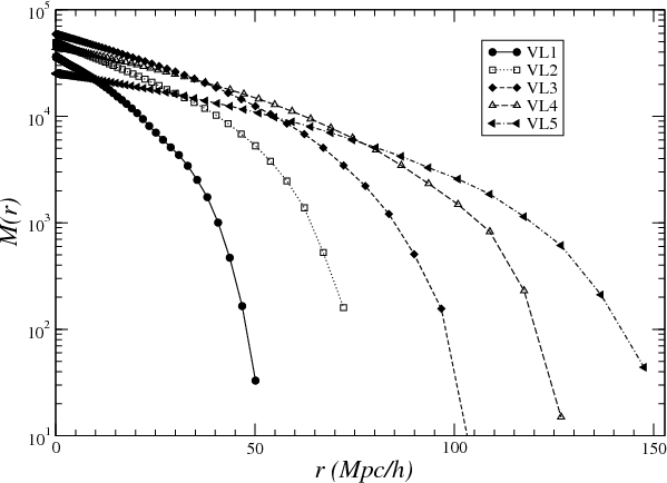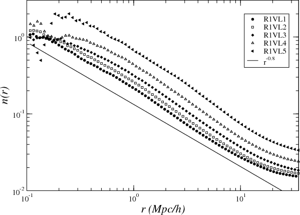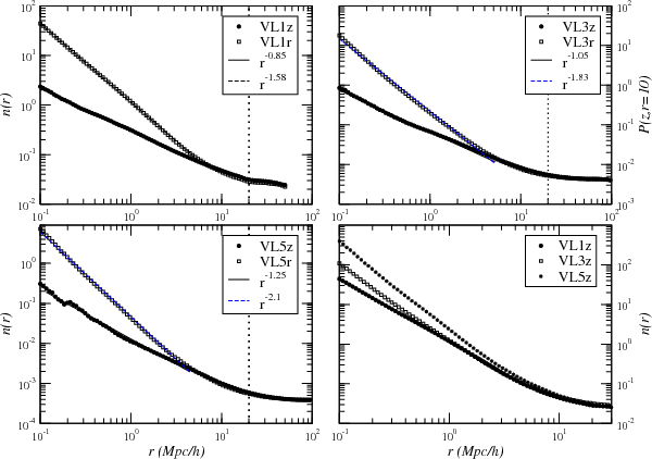 Figure 22: Conditional density in the mock R1VL1, R1VL3, and R1VL5 sample in real (e.g., VL1r, VL3r, VL5r) and redshift-space (e.g., VL1z, VL3z, VL5z). In the panel on the bottom left there is a comparison of the behaviors in the different samples in redshift-space, where it is evident that the exponent becomes steeper for brighter objects. The normalization is taken to have the same large-scale density. |