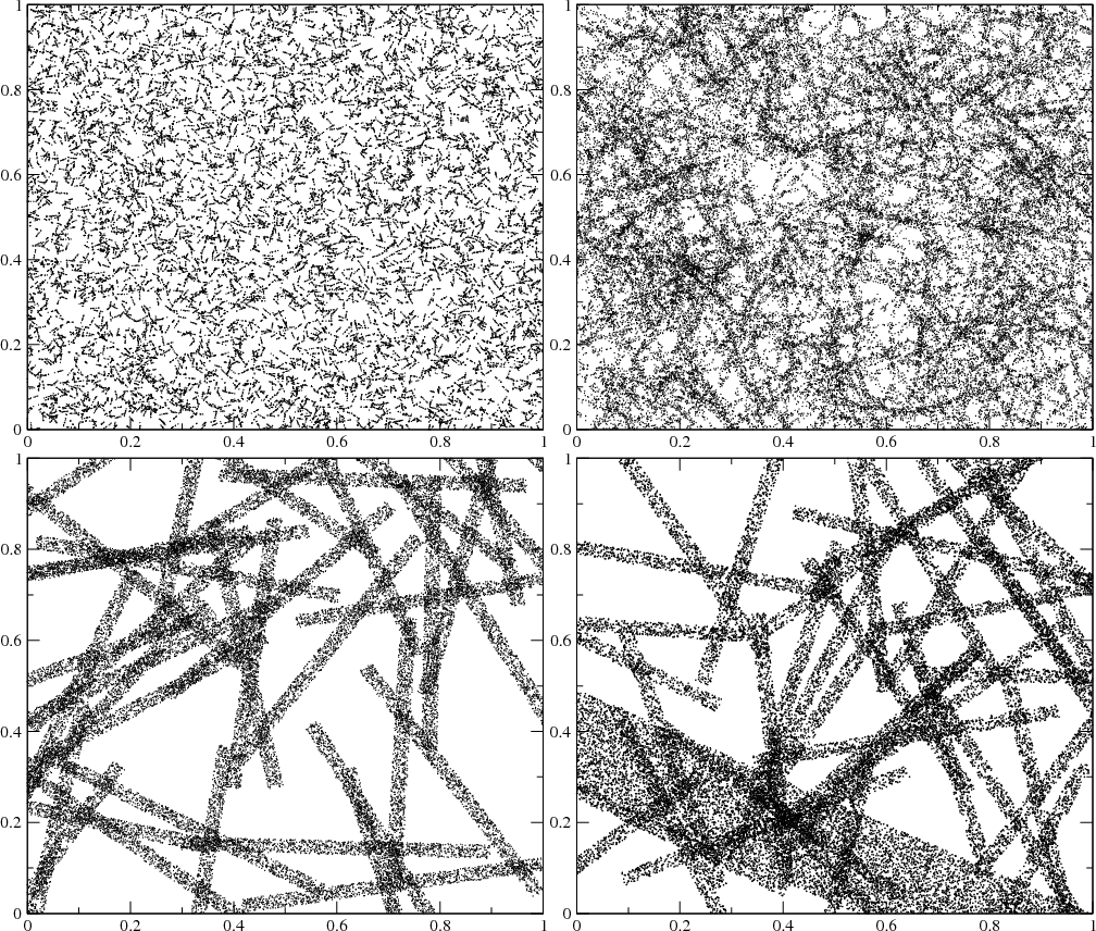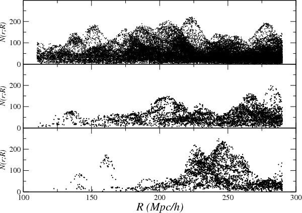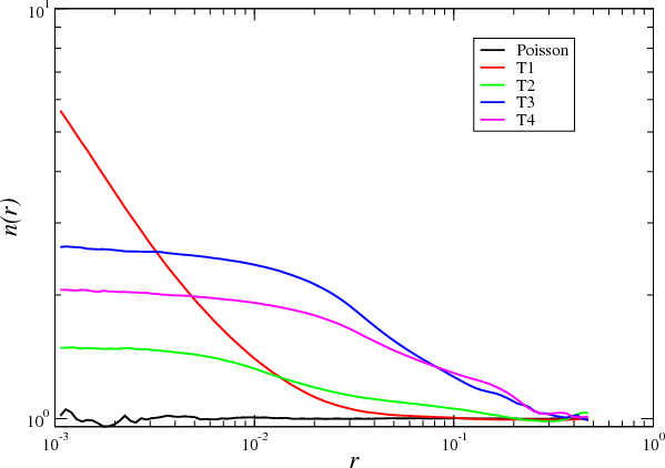 On the other hand, it may happen that galaxy distribution is not uniform. In this situation, the density measured, for instance, in a sphere of radius r randomly placed inside the sample, has large fluctuations; i.e., it varies wildly in different regions of the sample. In this situation the point distribution can generally present long-range correlations of large amplitude. Then it may, case (iii), or may not, case (iv), present self-averaging properties, depending on whether measurements of the density in different subregions show systematic (i.e., not statistical) differences that depend, for instance, on the spatial positions of the specific subregions. When this is so, the considered statistics are not statistically self-averaging in space because the PDF systematically differs in different subregions and whole-sample average values are not meaningful descriptors. In general, such systematic differences may be related to two different possibilities: (i) the underlying distribution is not translationally and/or rotationally invariant; (ii) the volumes considered are not large enough for fluctuations to be self-averaging.