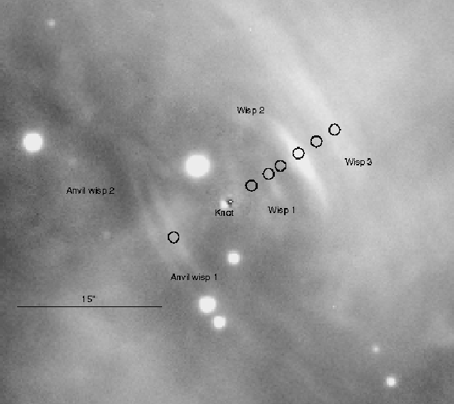 to the northwest of the pulsar and also in a nearby anvil wisp in terms