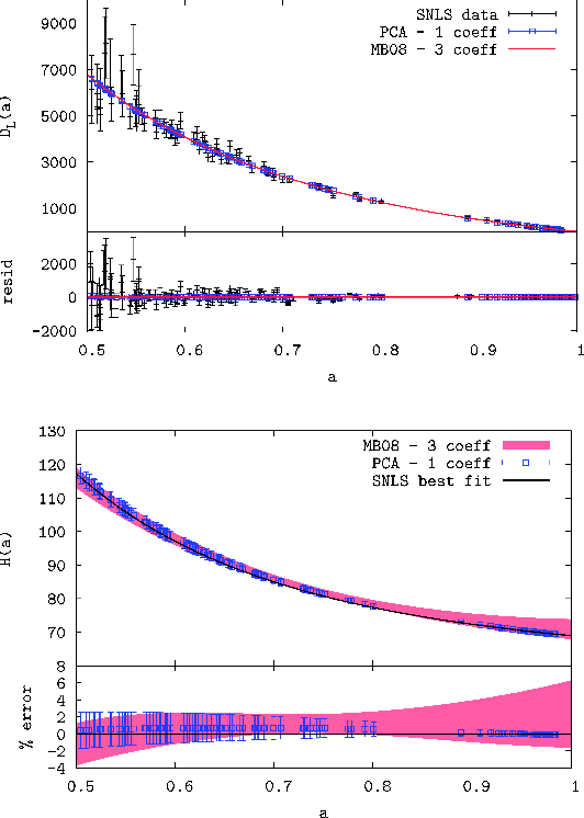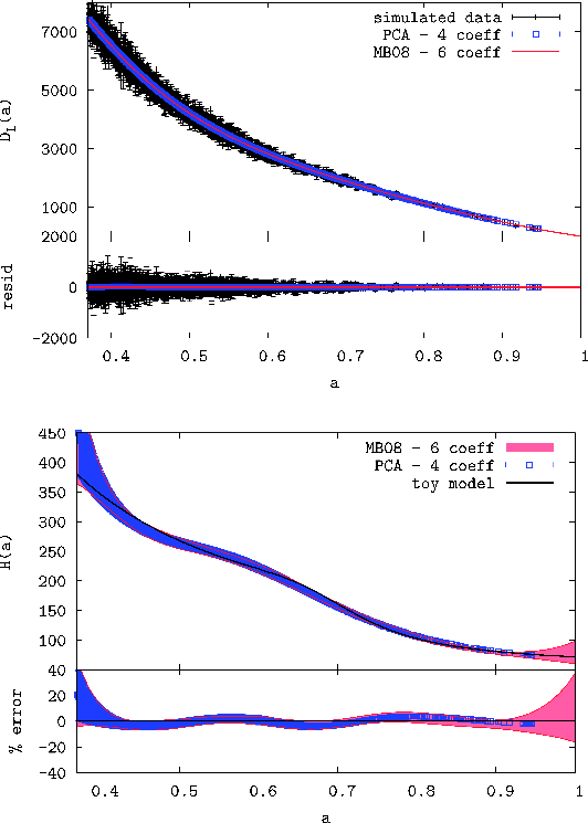 Several different techniques have been developed since then to appropriately treat the data in order to perform such a reconstruction (see, e.g. Tegmark 2002; Wang & Tegmark 2005; Huterer & Turner 2000; Daly & Djorgovski 2003; Huterer & Turner 1999), all of them employing a smoothing procedure in redshift bins. A recent reconstruction technique, which recovers the expansion function from distance data, has been developed in Shafieloo et al. (2006) and Shafieloo (2007), making use of data smoothed over redshift with Gaussian kernels, and generalised by Alam et al. (2008) to reconstruct the growth rate from the estimated expansion rate. An alternative method proposed by Mignone & Bartelmann (2008, hereafter MB08) reconstructs the expansion rate directly from the luminosity-distance data, by expanding them into a basis system of orthonormal functions, thus avoiding binning in redshift, and it has been extended in order to estimate the linear growth factor and to be applied to cosmic shear data (Mignone et al, in prep.). Also, principal component analysis (PCA) has been used to reconstruct the dark-energy equation of state parameter as a function of redshift (see, e.g., Huterer & Peiris 2007; Linder & Huterer 2005; Huterer & Cooray 2005; Simpson & Bridle 2006; Huterer & Starkman 2003).