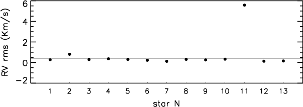 Figure 7: Radial velocity variations of the Li rich stars (filled circles) compared to the mean variations of the rest of the sample (solid line). |