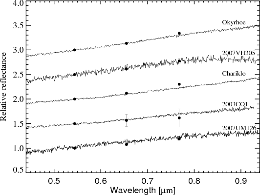 Each night, immediately before spectral measurements, photometric data in the V-R-I filters (except during the November and December 2007 runs, in which I filter observations were not taken) were obtained for each target, together with almost simultaneous photometric and spectroscopic observations in the near infrared with ISAAC and SINFONI instruments at VLT units 1 Antu and 4 Yepun. The results on V+NIR photometry are presented in Perna et al. (2009, in prep.), while the near infrared spectroscopic data are still under analysis.