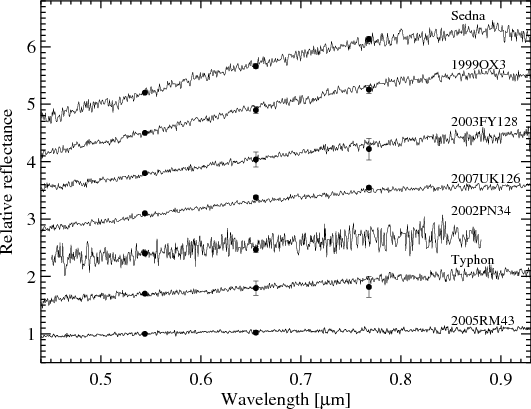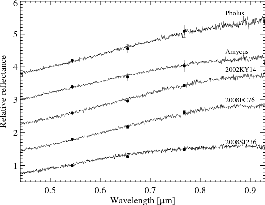 The new spectra of the Centaurs and TNOs are shown in Figs. 1-5. In these figures we also plot the V-R and V-I (when available) colour indices converted to relative reflectance, colours that show nice agreement with the spectral gradient.