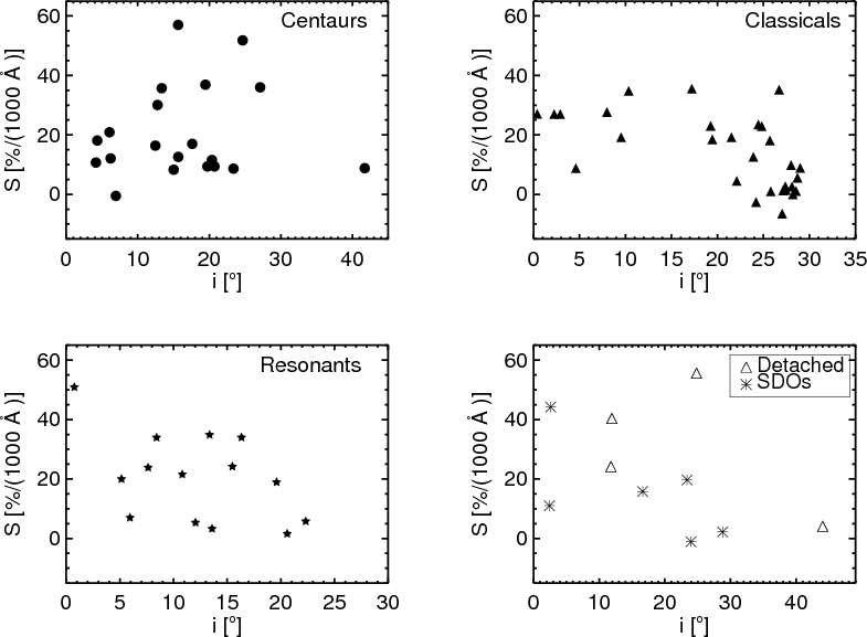 spectral slope and orbital inclination for the classical population.