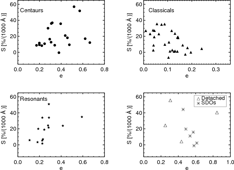 We found a strong correlation between S and e for resonant bodies, a similar but weaker one for Centaurs, while for SDOs we confirm the anticorrelation between S and e found by Santos-Sanz et al. (2009), even though it must be noted that our sample is very limited.