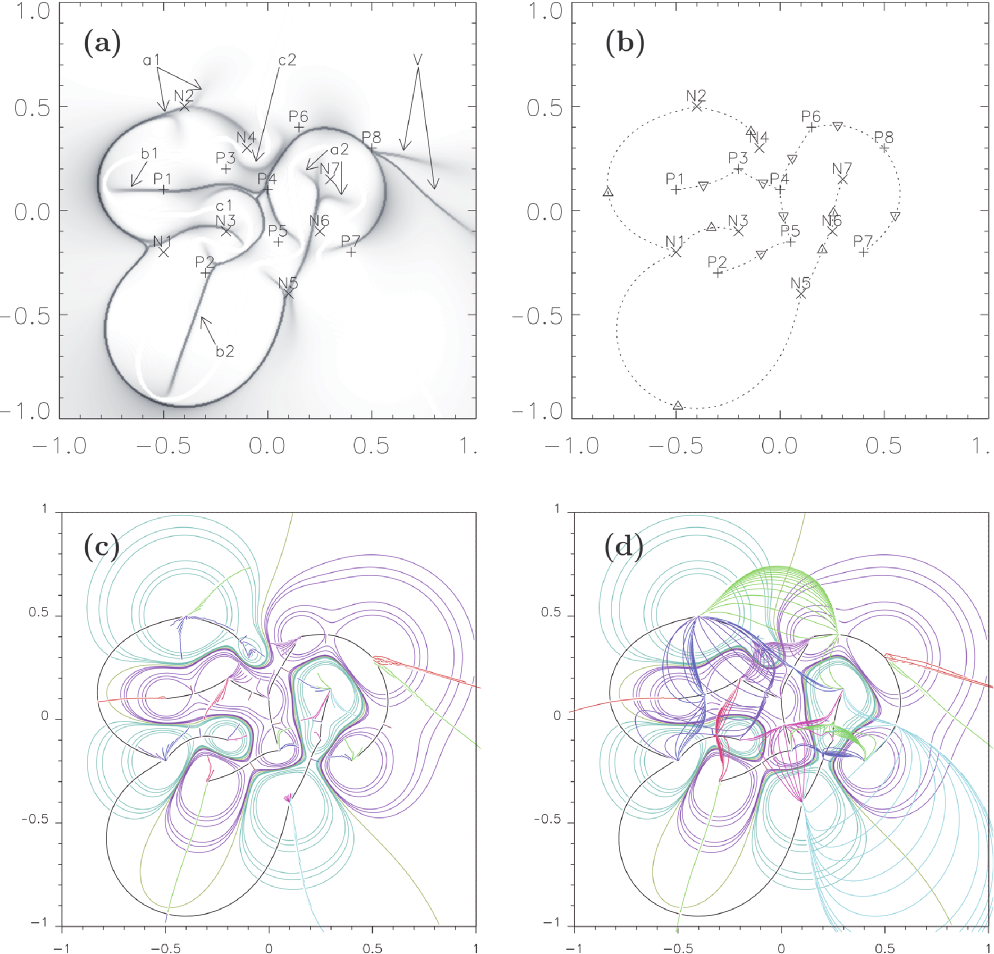 The occurrence of null points, in particular photospheric null points, and coronal separators, is a very natural property of magnetic field configurations which are formed by discrete photospheric flux concentrations (either singular or extended), around which there is no magnetic flux passing through the photosphere (e.g. Longcope & Klapper 2002; Priest et al. 2005; Close et al. 2005; Démoulin et al. 1994a; Gorbachev & Somov 1989; Maclean et al. 2009; Schrijver & Title 2002). Such models can therefore result in a complex distribution of distinct flux domains, whose boundaries are defined by separatrix fan surfaces. These fans form part of the skeleton of the magnetic field, when combined with their associated photospheric null points and spine field lines (Longcope 1996). Such models have been applied to observations of bright points (e.g. Longcope 2001; Maclean et al. 2009; Parnell et al. 1994) and flares (Des Jardins et al. 2009; Barnes et al. 2005; Longcope et al. 2005,2007). In general, however, the use of discrete sources and the magnetic skeleton has been applied to try and determine not only the number and approximate position of the reconnection sites, but also to determine the energy released during reconnection. This is because, with the magnetic skeleton, it is very easy to determine the amount of flux transferred between flux domains and hence estimates can be made of the currents generated and then released during these flux changes. In particular, this is the philosophy that led to the development of the minimum current corona model (Longcope 1996; Longcope & Cowley 1996; Longcope 2001), which has been used to model flares to determine where and how much energy is released (e.g. Barnes et al. 2005; Longcope & Silva 1998; Longcope et al. 2007). Furthermore, Priest et al. (2002) have applied the magnetic skeleton approach to create a coronal model to explain coronal heating. Close et al. (2004,2005) considered quiet-Sun magnetograms and, using the magnetic skeleton approach, were able to determine that during solar minimum all the magnetic connections within the corona are replaced in just 1.4 h, a factor of 10 times faster than the recycling time of the magnetic features in the quiet-Sun photosphere (Hagenaar 2001). When applied to flare observations, clear correlations have been found between the locations of observed chromospheric bright ribbons and of the low altitude trace of the modeled skeletons (e.g. Des Jardins et al. 2009; Longcope & Beveridge 2007; Démoulin et al. 1994a; Longcope et al. 2007).