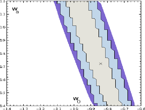 Figure 5: 68%, 95% and 98% constraints on w0 and waobtained from the UNION sample and the GRB sample corrected for the 3 outlying GRBs. The cross represents the best fit value and it is in a good agreement with that found using the theoretical model described in Sect. 2. |