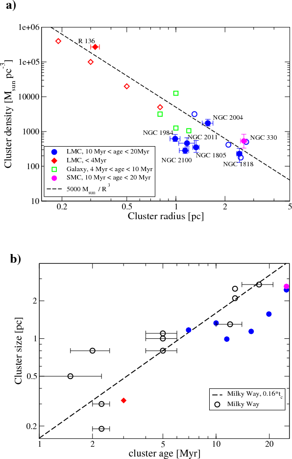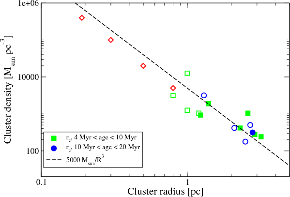 Figure 3: Cluster size as a function of cluster age. The Antennae clusters (data from Bastian et al. 2009) are shown as filled symbols. The Milky Way clusters are also indicated (open symbols). |