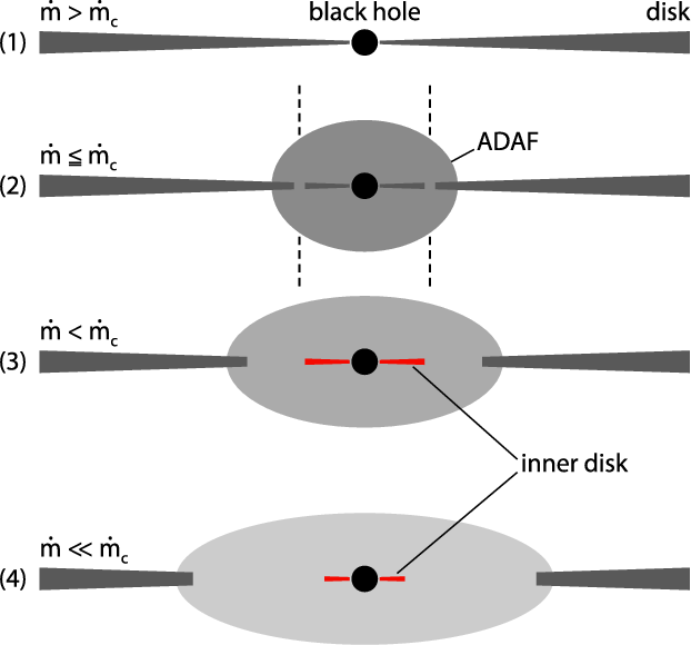 Fits confirming truncated disks with inner ADAF-filled regions were worked out for LMXBs, first for A0620-00 and V404 Cyg (Narayan et al. 1996, 1997). Esin (1997) applied the model to state transitions observed for SXT Nova Muscae and Cyg X-1, leading to a description of the configuration of the accretion geometry for different spectral states that varies with the mass flow rate (Esin et al. 1997), adequate for black holes of different mass. Applications to Galactic nuclei were equally successful; the first application concerned Sgr A* and successfully explained its low radiative efficiency (Narayan et al. 1995). For a review of early investigations of AGN see Narayan et al. (1998).