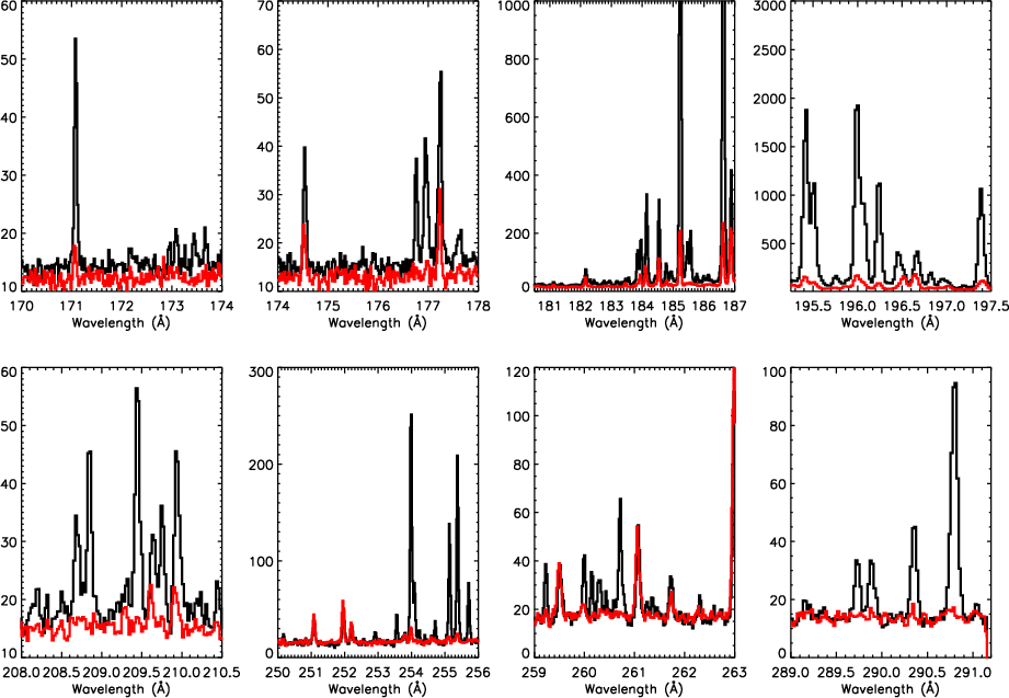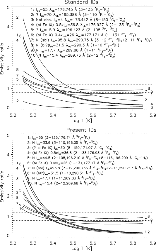 The emissivity ratio curves relative to the O VI and O V EUV transitions observed by Hinode EIS are shown in Fig. 9. The density obtained from the O V lines is very close to what expected. Excellent agreement is found between observed and predicted intensities. This rules out the possibility of blending with other TR lines. This is an important issue for the 192.8 Å blend, where the Ca XVII resonance line and at least two other Fe XI lines are present. This is because the Ca XVII is the strongest line in an important temperature range, and efforts are on-going to estimate the Ca XVII from the observed blend (see, e.g. O'Dwyer et al. 2009).