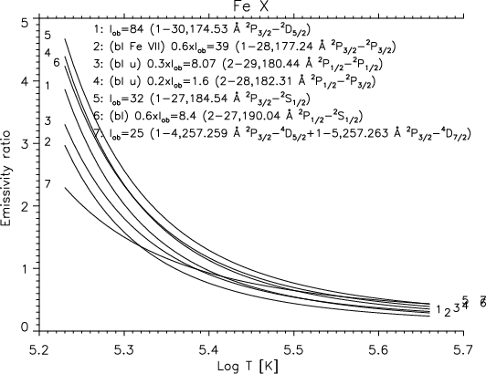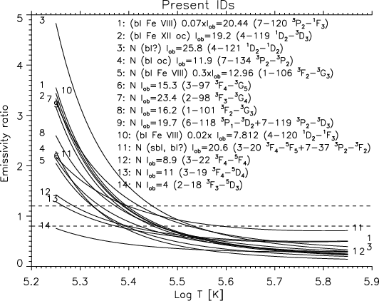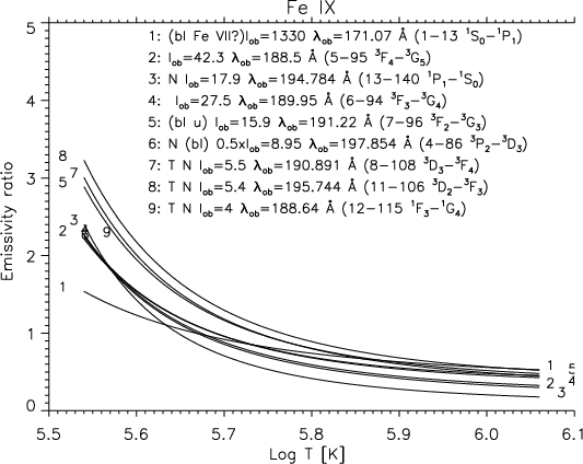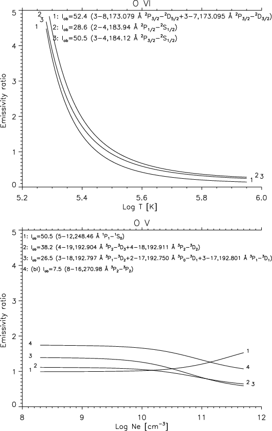 Figure 9: The emissivity ratio curves relative to the O VI and O V EUV transitions observed by Hinode EIS. |