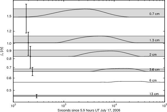 Figure 2: Model-predicted light curves of Sgr A* at key radio frequencies using model parameters shown in Table 1. Also shown as errorbars between t=200 s and t=300 s are the rms flux variability of Sgr A* averaged over many flares as compiled by Falcke et al. (2009). The gray bands have a width of 0.6 times the rms variability of Sgr A*, which is roughly matched to the specific flare under consideration. |
